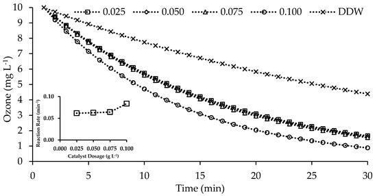 Promotion of ozone decomposition with different catalyst dosage (The catalyst dosages are given in g L−1, DDW: Deionized and distilled water, Conditions: t = 22 °C, pH = 6.72, [O3] = 10 mg L−1).