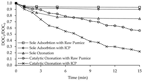 As shown in Figure 6, the lowest degradation of NOM occured in sole adsorption with raw pumice and iron coated pumice, resulting in the removals of 6.57% and 9.89% of the initial DOC after 15 min, respectively. DOC removal with sole ozonation was 24.87%. Also, a remarkable reduction of 44.16% and 77.86% DOC removals was observed in catalytic ozonation with raw pumice and ICP, respectively. This high percentage, together with the fact that the DOC removal in the ICP/O3 is still faster than that of sole-ozonation, suggests that the presence of ICP effectively increased the yield of radical OH•, and the high OH• dominates the improvement of NOM degradation. The experimental results suggest that the presence of the ICP catalyst has a synergistic effect with ozone for the degradation of NOM, as in other studies [20,21,22].