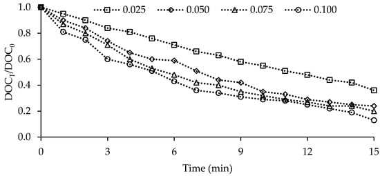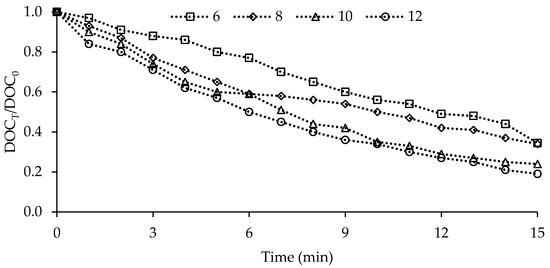 The heterogeneous catalytic ozonation of NOM in the aquatic environment is a reaction system containing the entire gas-liquid-solid phases. In this system, ozone concentration is an important factor affecting the degradation efficiency of NOM. In this title, the effect of starting ozone dosages of 6, 8, 10, and 12 mg L−1 on the catalytic ozonation process was analyzed. Figure 8 shows the change in DOC parameter, depending on the initial ozone dosage.