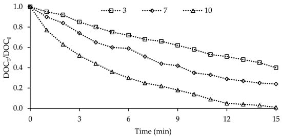 Although the pH value of the solution does not directly affect the OH- concentration, it affects the acid dissociation constant (pKa) and the catalyst surface [29]. The pH value has an extraordinary effect on ozone decomposition and catalytic ozonation process. The effect of the initial pH value on the DOC removal in the catalytic ozonation process is investigated in Figure 10.