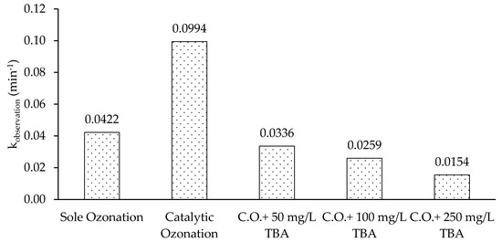 As seen in Figure 14, the OH• fraction (ƒOH•) varies from 66.2% to 84.5% depending on the TBA concentration. OH• proved to be the predominant species in catalytic ozonation.