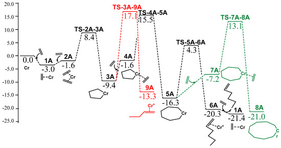 Calculated reaction profile for model A catalyst (free energies in kcal/mol). Black and red lines illustrate Gibbs free energies in solvent of ethylene tri- and dimerization, respectively, in green the alternative formation of the 9-membered ring.