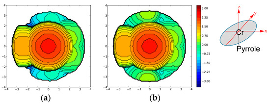 Topographic steric maps of the pyrrole ligands (plane xy) for the optimized complexes (a) A and (b) D. The Cr atom is at the origin and the center of mass of the pyrrole is on the z axis. The isocontour curves of the steric maps are given in Å.