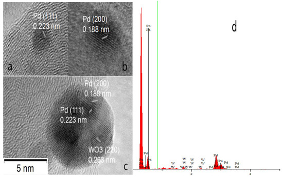 The morphology and particle distribution (Figure 2) of Pd/C (a, b) and oxide-rich Pd0.8W0.2/C (c, d) were characterized by transmission electron microscope (TEM). The oxide-rich Pd0.8W0.2 nanoparticles are more uniformly dispersed on the carbon surface than Pd. The average diameter of Pd nanoparticles is 5.6 nm while the average metal particle diameter of oxide-rich Pd0.8W0.2 is 4.3 nm which are consistent with the XRD results. Figure 3a–c shows high resolution transmission electron microscopy (HRTEM) of oxide-rich Pd0.8W0.2/C catalyst. The lattice spacing in Figure 3a–c is 0.224 nm, 0.193 nm and 0.263 nm which respectively correspond to the (111), (200) crystal planes of face-centered cubic Pd and (220) plane of WO3. The lattice fringes of WO3 can be found in a few nanoparticles, which supports the existence of WOx in the Pd0.8W0.2/C catalysts. Although the WO3 phase is found in a few nanoparticles, there is no W phase or WO3 phase in most of the Pd–W alloy nanoparticles, which is consistent with the XRD patterns. It indicates that most of the W atoms have been mixed with the Pd atoms during the preparation of Pd–W alloy nanoparticles from the uniform mixtures of Pd salt and W salt, thus the separate W or WO3 phase is rare. Besides, the W atoms on the surface of Pd–W nanoparticles are easily oxidized by ambient air, therefore it is difficult to find the W phase on the surface of Pd–W nanoparticles. Although there is no diffraction peak corresponding to W in the XRD patterns mentioned above, the energy dispersive spectrum (EDS) of the as prepared oxide-rich Pd0.8W0.2/C (Figure 3d) shows the content of W in the Pd–W nanoalloys.