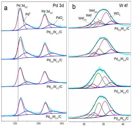 X-ray photoelectron spectroscopy (XPS) spectra of (a) Pd 3d and (b) W 4f) of oxide-rich PdW/C catalysts.