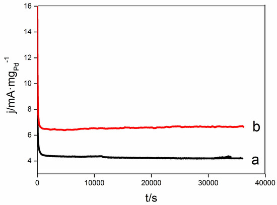 Chronoamperometry (CA) curves are often used to evaluate the stability of electrocatalysts [67,68]. Electrocatalytic stability of Pd/C and oxide-rich Pd0.8W0.2C catalysts were characterized by CA at 0.57 V vs. RHE in 0.1 M NaOH solution (Figure 7). At the beginning the CA current decreased rapidly, then the current density of each catalyst became relatively stable. The rapid decrease in the initial 1 or 2 s may be the charging current at the working electrode (WE). At the beginning of the CA measurements, the potential at the WE rapidly shifted to the set potential (0.57 V vs. RHE). The rapid shift of potential caused a charging current at the WE. Although the oxide-rich Pd0.8W0.2/C catalyst exhibits higher electrocatalytic stability than Pd/C, it is still difficult to draw a conclusion of whether the composition of the catalyst is unchanged during the ORR measurements. Catalysts with constant compositions such as pure Pd [69] or pure Pt [70] sometimes exhibit poor electrocatalytic stability. Therefore the high electrocatalytic stability does not mean constant composition. It can be seen from Figure 6 that Pd0.9W0.1/C also exhibits high activity. That means even if a half of the W/WO3 de-alloyed from the Pd0.8W0.2 nanoalloys, the Pd–W catalysts still maintain high activity. The current density (mA·mg Pd−1) at the oxide-rich Pd0.8W0.2/C is more than 1.6 times of that at Pd/C.