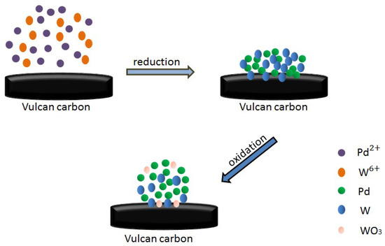 After their calculations based on quantum mechanics, Goddard et.al. [47] predicted that Pd3W was a prospective catalyst for ORR, which was confirmed by our previous work for Pd0.7W0.3 in acid media [48]. To date, Pt-based electrocatalysts are commonly used in commercially available electric vehicles powered by fuel cells. Goddard and his coworkers examined the critical barriers of the ORR with Pd3W and compared them to the analogous barriers for Pd and Pt. The results demonstrated that Pd3W exhibits ORR properties greatly improved over pure Pd and close to that of pure Pt. Since the cost of Pd3W is six times less than that of pure Pt, a highly efficient Pd–W system is a promising candidate for future application. In this work, we attempt to fabricate high performance Pd–W/C systems for ORR in alkaline media. Most of the noble metal electrocatalysts used in fuel cells are in the form of naonoparticles supported on carbon. Since the surface of metal nanoparticles is easy to be oxidized by ambient air, the effect of oxides in the Pd-based catalysts for ORR in alkaline media should be discussed. There have been some state-of-art electrocatalysts based on oxides such as Fe3O4@NiFexOy [49]. However, as the resistance of semiconductor oxides is higher than that of metals, the output voltage will decrease when the oxides are directly used as electrode materials in fuel cells or metal–air batteries. Combining the oxide with a high-conductive metal in each of the nanoparticles of catalysts is a solution for avoiding the decrease. The interaction of metal and metal oxides in catalysts has attracted research interests for decades [50,51,52,53]. It has been reported recently that metal and metal oxides interactions are greatly affected by the catalytic consequence of electrocatalysis reactions such as the oxygen reduction reaction [54] and the ethanol oxidation reaction [55,56]. Bulk WO3 crystal can be dissolved in strong NaOH solutions, which limits its direct application in fuel cells operating with alkaline electrolytes. To solve this problem, we started by separating the W atoms with noble metals such as Pd in the atomic scale before their oxidation. Therefore the chemical bonds attached to most of the W atoms are not W–O–W bonds but Pd–W metallic bonds, which are more stable than W–O–W bonds in alkaline solutions. According to the Monte Carlo simulation [57,58], alloy clusters at the surface of nano-materials sometimes exhibit higher stability. Then, we fabricated WOx-containing Pd–W nanoalloys with the reduction– oxidation method (Scheme 1). The onset potential of ORR at the as prepared oxide-rich Pd0.8W0.2/C (Pd/W = 8:2, metal atomic ratio) is close to the Pd/C and Pt/C fabricated with the chemical reduction method [36]. The ORR stability and current density (mA·mg Pd−1) of the oxide-rich Pd0.8W0.2/C are higher than those of Pd/C, which indicates that the oxide-rich Pd0.8W0.2/C is a prospective candidate for the cathode of fuel cells.