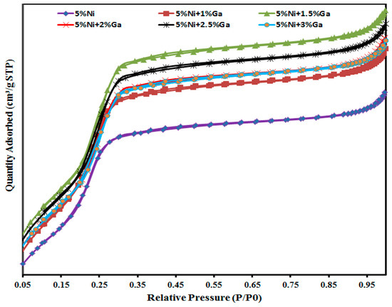 Figure 1, depicts the N2 adsorption-desorption isotherms of 5%Ni+x%Ga/MCM-41 (x = 0, 1, 1.5, 2, 2.5) catalysts, while Table 1 presents the pore diameter, surface area, and pore volume for the modified and unmodified Ni-based catalysts. The modification by small amounts of Ga resulted in higher surface areas with a maximum surface area of 1036 m2/g for 2.5% Ga; conversely, as the loading increased to 3%, the surface area slightly decreased. A plausible explanation for the effect of the promoter Ga relates to the fact that small amounts Ga increases the dispersion of the active metals of the catalyst. However, when the amount is further increased, it is possible that it overlaps the Ni sites promoting multilayer deposition—hence reducing the available surface area. This factor was observed before [31]. The MCM-41 was prepared from different precursors and verified the tested one in this work and the surface area determination was repeated. The result was placed in the revised manuscript. The BET value for bare MCM-41 tends to be 1132.72 m2/g.