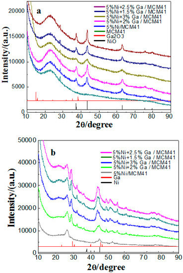 X-ray diffraction patterns for fresh and spent 5%Ni+x%Ga/MCM-41 (x = 0.0, 1.5, 2.0, 2.5, and 3.0) catalysts are shown in Figure 2. It can be observed that MCM-41 has no diffraction peaks due to the amorphous nature of mesoporous silica. Upon the XRD measurement for the fresh calcined Ni loaded sample (Figure 2a), NiO characteristic peaks were observed which is consistent with JCPDS no. 01-089-5881. The addition of various amounts of Ga did not lead to the appearance of any new phases, but only increased the intensity of the NiO peaks, suggesting that Ga enhanced the crystallization and growth of the Ni particles. However, after performing the H2 reduction on the spent samples (Figure 2b), the X-ray diffraction patterns were significantly changed due to the formation of a Ni phase with its characteristic peak (111) at 2θ = 45° and (200) peak at 2θ = 53°. However, another strong diffraction peak, observed at 2θ = 28°, could be attributed to crystallized silica because of the high temperature and reduction conditions. The peak at 2θ = 30° could be attributed to the Ga metal formed from the reduction reaction. The main peaks at 2θ = 35, 45, 47, 50, and 53° could be due to the formation of Ni-Ga intermetallic compounds [32,33]. The amount of Ga loading, however, did not affect the Ni-Ga intermetallic phase.