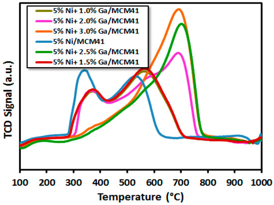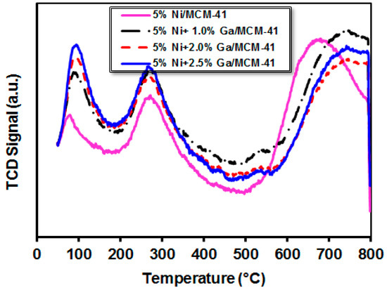 Figure 3 shows the H2-TPR profiles of the 5%Ni/MCM-41, 1.0%Ga5%Ni/MCM-41, 1.5%Ga5%Ni/MCM-41, 2.0%Ga5%Ni/MCM-41, 2.5%Ga5%Ni/MCM-41, and 3.0%Ga5%Ni/MCM-41 samples. All catalysts showed two main reduction peaks except the 3.0%Ga5%Ni/MCM-41. It can be viewed that the intensity of the first peak decreased and slightly shifted as the Ga loading increased and eventually disappeared for the 3.0% Ga loading. Both 2.5% Ga and 3.0% Ga presented peaks at high temperatures indicating the relatively stronger metal support interactions compared to other % loadings of Ga. It can also be seen that there was no reduction peak before 360 °C for all catalysts; this implies the disappearance of NiO on the silica pore wall surface [20]. The second peak was significantly shifted from 520 °C to 700 °C for 0.0% and 3.0% Ga, respectively, and the peak intensity broadened. This can be interpreted as the reduction of Ni ions situated at different layers in the pore wall [20], indicating an intense interaction between the Ni particles and the MCM-41 support. The shift of TPR peaks might be reasonably attributed to the strong interaction between the metal and the support and by a reduction in the particle size of the bulk material to ultrafine particles [34].