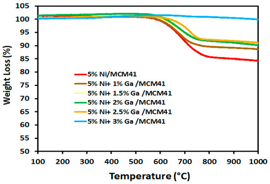 Thermogravimetric analyses (TGA) of both fresh and spent catalysts were used to quantitatively measure the carbon formation during the reaction. The TGA analysis was carried out under air atmosphere. The life of the spent catalyst was about a day. For the fresh catalyst, the TGA analysis showed no weight loss and hence no carbon deposition. The typical TGA results from spent catalysts are shown in Figure 5. A significant weight loss was observed between 600 and 750 °C. This can be explained by the combustion of the carbon deposited on the catalyst [24]. Increasing the Ga content in the catalyst decreased the amount of carbon. For example, for 5% Ni/MCM-41, the weight loss was about 16%; however, there was no weight loss for 3.0%Ga5%Ni/MCM-41. This change in weight loss cannot be correlated to the catalytic activity. It is possible that the deactivation of this catalyst is not due to carbon deposition on the external surface, but perhaps due to the deposition of carbon within the pores of the MCM-41 support which would be an irreversible deactivation. It could also be due to the destruction of the MCM-41 structure due to high Ga content.