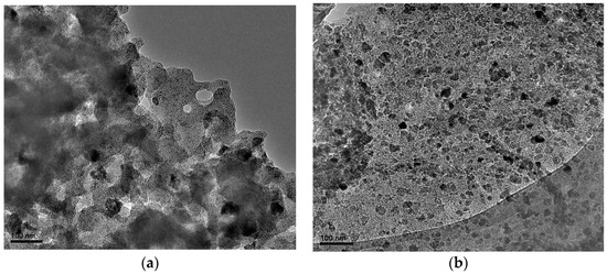 Figure 6a,b display the TEM images of the 5%Ni/MCM-41 and 2%Ga5%Ni/MCM-41, respectively. The images show that the uniform ordered hexagonal pores of MCM-41 are still observed after metal loading [17], i.e., the long ordered arrangement of the channels in the matrix are preserved [37]. This demonstrates that the Ni particles were homogeneously dispersed in the form of round nanoparticles. The TEM images presented in Figure 6 reveal an average particle size that ranges from 25–40 nm for 5%Ni/MCM-41 and 16–33 nm for 2%Ga5%Ni/MCM-41. The uniform distribution of the Ni nanoparticles in the MCM-41 framework is apparent from the TEM image in Figure 6b.