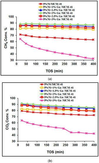 The locations with darker contrast in the images in Figure 6a are ascribed to the Ni particles [36]. The minor dark spots are attributed to Ni particles located in the channels of the MCM-41 support. The larger dark areas over the pores correspond to Ni oxide agglomerates on the external surface, which resulted from the migration of Ni species out of the supports during the calcination process [34,37]. It can be seen that the Ni nanoparticles (dark points) were embedded within the mesoporous structure when Ga was introduced [38], which reduced the aggregation of NiO nanoparticles during the calcination step [39]. This observation further supports the bigger and larger reduction of the peak of Ga-Ni nanoparticles (TPR, Figure 2) in the chemisorption experiment. TEM images demonstrated a nearly regular hexagonal array of mesoporous channels of the catalyst [40]. The CH4 and CO2 conversions are presented in Figure 7. In this investigative stage, we have used TOS to reflect the stability of the Ga-promoted Ni/MCM-41. In this investigation we have not quantified the total number of active sites to determine the turn over frequency. As shown, both CH4 and CO2 conversions did not change for the catalysts with Ga loadings from 1–2.5% during the reaction period of 400 min. However, the 3% Ga loading showed lower activity and lesser stability than the 0% Ga-loaded catalyst. This is either because the catalyst is not easily reduced as shown in Figure 2, or due to the destruction of the framework of the MCM-41 support. Ga-incorporated Ni catalysts showed higher catalytic activity than that of the unmodified Ni-MCM-41 (0% Ga) catalyst, except for 3% Ga loading. This indicates that there should be an optimum Ga loading to enhance the catalytic activity and stability. As shown in Figure 8, 2% Ga loading showed a higher conversion of CH4 and lower activity loss of 88.2% and 1.58%, respectively. The main disadvantage of using catalysts for this process is due to the deactivation. This phenomenon cannot be avoided, but often reduced to an acceptable level. For instance, 2% Ga loading catalyst (2%Ga5%Ni/MCM-41) showed a higher conversion of CH4 (88.2%) and lower activity loss of 1.58%, for 400 min of TOS.