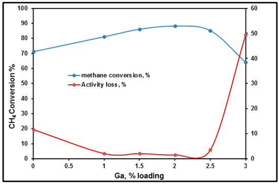 Effect of Ga loading on CH4 conversion and deactivation over 400 min on stream at 800 °C reaction temperature, at atmospheric pressure, CH4:CO2 = 1:1 in the feed gas, catalyst weight: 0.1 g, WHSV: 21,000 mL g−1 h−1.