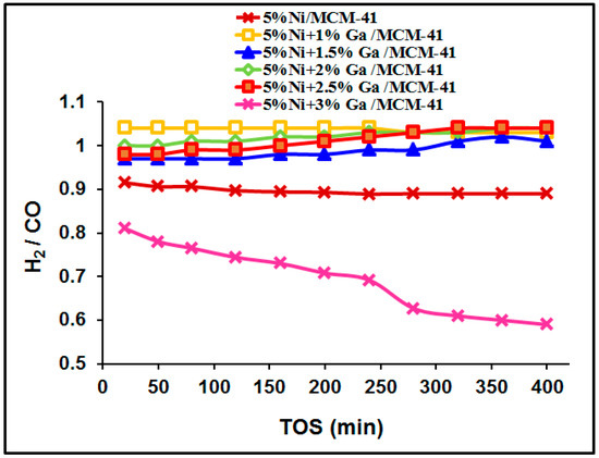 The most obvious disadvantage of Ni-based catalysts is the poor stability and a H2/CO ratio of less than unity, which is partly caused by the reverse water gas shift (RWGS) reaction. The H2/CO ratios for the different Ga loadings are shown in Figure 9. It is clear that the Ga promoter had a significant effect on the H2/CO ratio as the ratio increased from 0.9 to unity with the addition of Ga. This improvement could possibly be related to the Ga-suppression of the RWGS reaction and/or the enhancement of the DRM rate (H2 formation rate) relative to the RWGS reaction [28].