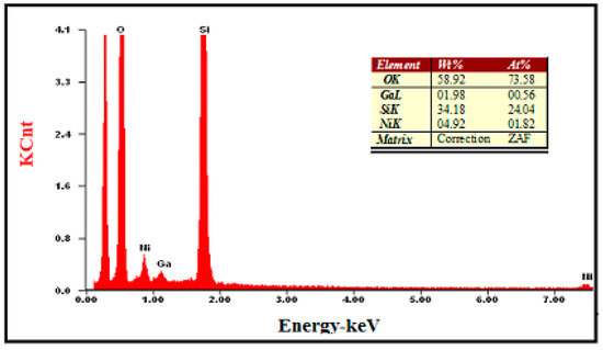 Supported Ni catalysts were obtained by the incipient wetness impregnation method. The desired weight of [Ni(NO3)3·6H2O] was placed in double-distilled water, following which the MCM-41 support was impregnated with the active metal salt. The active metal impregnation of the support was performed under stirring at 80 °C for 3 h. then the impregnated catalysts were dried at 120 °C for 12 h, followed by 3 h calcination at 600 °C. The prepared catalysts were then reduced at 800 °C for 1 h under H2/Ar flow mixture (20/80). The conventional method of catalyst reduction at temperatures below and equal to calcination temperatures is not anymore maintained, partly because it has been observed in TPR that some peaks appear at temperatures higher than that of calcination temperature. Han et al. calcined their catalyst at 550 °C and performed the reduction and reaction at 800 °C [41]. The Ni amount was fixed at 5 wt %; in a previous publication, the optimum amount of Ni was about 5% [42]. The 5 wt % Ni/MCM-41-promoted catalysts with various loadings of Ga (0.0, 1.0, 1.5, 2.0, 2.5, and 3.0 wt %) were formed from the co-impregnation of Ni (NO3)3·6H2O and Ga(NO3)3·H2O using an MCM-41 support as described above. An elemental analysis of fresh 5%Ni+2.0%Ga/MCM-41 catalyst was performed to verify the desired composition. Figure 11 and the embedded table display the spectrum and the elemental compositions from qualitative and quantitative points of view. The embedded table denotes the masses of the catalyst containing about 5% Ni and 2% Ga. Thus the EDX result confirmed that the desired catalyst was achieved.