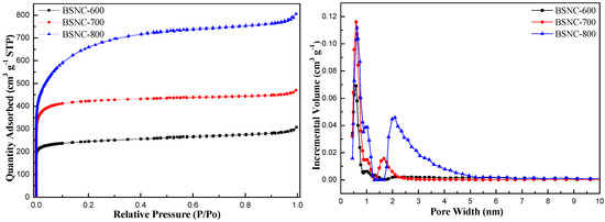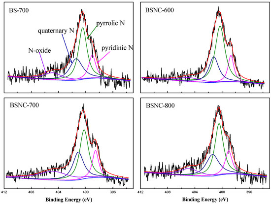 The porous carbon materials were further examined by an elemental analyzer and X-ray Photoelectron Spectroscopy (XPS), which could be estimated that the carbons were nitrogen-doped by itself. As shown in Table 2, the raw material has a relatively high N content of 4.27%, which is helpful to prepare biomass-based nitrogen-doped carbons. When the bamboo shoot simultaneously carbonized and activated with KHCO3, the N content of BSNCs decreased from 4.65% to 1.06% with an increasing temperature from 600 °C to 800 °C. This was because organic compounds probably formed NO, NO2 or other nitrogen containing gases during the calcination process. This coincided with the results of the references [33,34], which showed that the temperature caused thermal decomposition of the nitrogen groups.