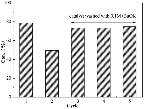 Recyclability is one of the important properties of the catalyst. In order to determine the recycling property of the catalyst for the Knoevenagel condensation, BSNC-700-tBu (0.1 M) was used as the catalyst for the reaction of benzaldehyde and malononitrile at temperature of 70 °C for two hours. After the first reaction, the catalyst was separated then washed with ethanol and deionized water. Then the catalyst was dried at temperature of 70 °C for next recycling use. Figure 4 showed the catalyst activities during five successive reactions. The catalyst was found to decrease its activity in the second run. The main reason was the formation of organic acids, such as benzoic acid, which covered the exposed base sites and decreased its activity. When the catalyst was washed using 0.1 M tBuOK solution, it obviously recovered its catalyst activity. This indicated that the basic solution could remove the organic acids existed on the surface of catalyst. The results also confirmed that BSNC-700-tBu (0.1 M) was recyclable as the base catalyst.