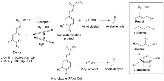 (a) Transesterification of a vinyl activated donor with acceptors of different lipophilicity (prenol, 1-butanol, glycerol, or l-arabinose); (b) Hydrolysis of donor observed as side-reaction during transesterification. Under normal conditions vinyl alcohol tautomerizes to acetaldehyde.