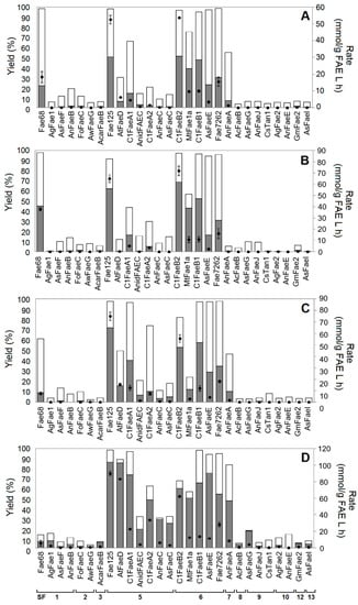 In addition to the partial agreement of the transesterification yields with the ABCD classification, there was no observed correlation between the synthetic and hydrolytic activities of evaluated enzymes. For instance, AsFaeF (SF1) and AsFaeI (SF13) from A. sydowii had high hydrolytic activities (Table 2), but they did not exhibit any synthetic activity (Figure 2). Similarly, among the C1-expressed FAEs, Fae68 (SF1) had the highest hydrolytic activity, but showed only moderate synthetic activity, while Fae125 had one of the lowest hydrolytic activities while being the most potent synthetic biocatalyst evaluated in this study.