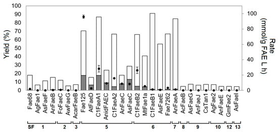 With 800 mM glycerol, the highest transesterification rates were observed for Fae125 (SF5) (90 mmol g−1 FAE L−1 h−1) and AtFaeD from Aspergillus terreus (SF5) (83 mmol g−1 FAE L−1 h−1) followed by C1FaeB2 (SF6) (61.9 mmol g−1 FAE L−1 h−1) (Figure 2D). All evaluated enzymes synthesized GFA in varying yields. Generally, the acetyl xylan esterase-related FAEs (SF5-6) showed the highest GFA yields (18.8–86.4%). In more detail, the highest yields were observed for Fae125 (SF5) (86.4%) and AtFaeD (SF5) (85.5%), followed by AsFaeE (SF6) (75.5%) and C1FaeA1 (SF5) (73.5%). FAEs C1FaeB1 (SF6) and C1FaeB2 (SF6) from M. thermophila C1 showed similar yields (65.5% and 59.4%, respectively) comparable to PFA and BFA synthesis. The lipase-related AnFaeA from A. niger (SF7) showed moderate yield (47.4%), while the tannase-related FAEs (SF1–3, SF10–11) and choline esterase-related FAEs (SF12–13) exhibited considerably lower transesterification yields (0.3–7.0%). Fae68 (SF1) showed a consistently lower yield with glycerol (6.3%) when compared to PFA and BFA synthesis.