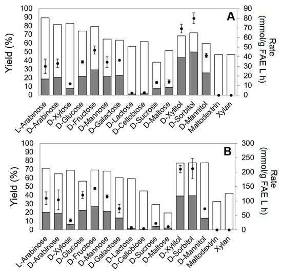 Synthesis of sugar esters by (A) C1FaeA1 and (B) Fae125. Reaction conditions: 50 mM VFA, 50 mM sugar (except for 30 mg/mL xylan or maltodextrin), 0.1 mg protein mL−1, 19.8:74.7:5.5 v/v/v n-hexane: t-butanol: buffer, 45 °C, no agitation, 8 h of incubation. Grey column: transesterification yield; white column: hydrolysis yield; black circle: specific rate of transesterification. The error bars represent the standard deviation between two duplicates.