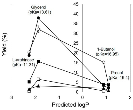 Effect of acceptor polarity on the transesterification yield of selected FAEs representing different phylogenetic subfamilies. Black circle: C1FaeA1 (SF5); white circle: Fae125 (SF5); black square: C1FaeB2 (SF6); white square: Fae68 (SF1); black triangle: AnFaeA (SF7). Reaction conditions: 50 mM VFA, 50 mM acceptor, 0.1 mg protein mL−1, 19.8:74.7:5.5 v/v/v n-hexane: t-butanol: buffer, 45 °C, no agitation, 8 h of incubation. The error bars represent the standard deviation between two duplicate.