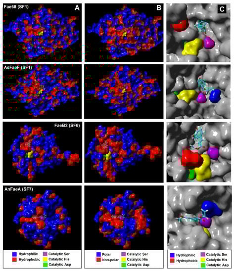 Predicted surface (A) lipophilicity (B) polarity of selected FAEs and (C) docked VFA inside the active site of selected FAEs. Homology models built by YASARA Structure (YASARA Biosciences GmbH, Vienna, Austria) (SF1, 2, and 6 FAEs) and the solved structure of AnFaeA (PDB ID: 1UWC) were used for SMD simulations.