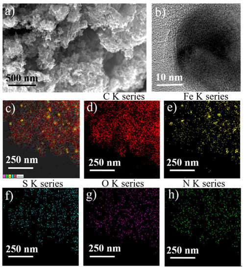 Figure 1. (a) Scanning electron microscopy image of Fe-N/Fe3C/Fe/C-800; (b) high-magnification TEM images of Fe-N/Fe3C/Fe/C-800; (ch) HAADF-STEM-EDS images of Fe-N/Fe3C/Fe/C-800.