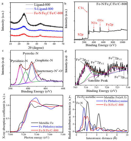 Figure 2. (a) XRD spectra of Ligand-800, S-Ligand-800 and Fe-N/Fe3C/Fe/C-800; (b) full XPS spectrum of Fe-N/Fe3C/Fe/C-800; (c) XPS spectra of Fe2p for Fe-N/Fe3C/Fe/C-800 in the range of 705 to 730 eV; (d) XPS spectra of N1s for Fe-N/Fe3C/Fe/C-800; (e) XANES spectra for Fe K-edge of Fe-N/Fe3C/Fe/C-800 and references; and (f) EXAFS spectra for Fe K-edge of Fe-N/Fe3C/Fe/C-800 and references.