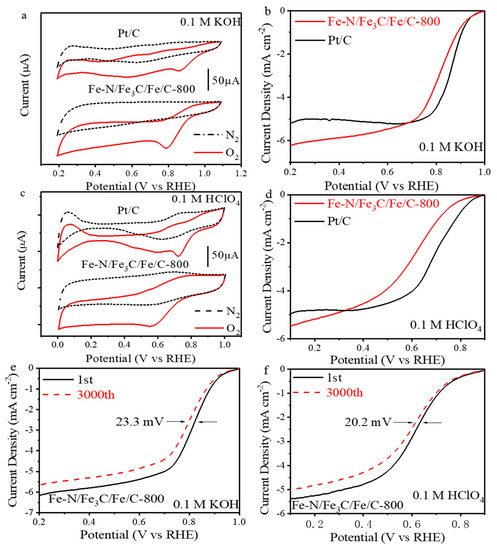 Figure 3. (a) Cyclic voltammograms of Pt/C and Fe-N/Fe3C/Fe/C-800 in 0.1 M KOH; (b) Oxygen reduction reaction (ORR) polarization curves of Pt/C and Fe-N/Fe3C/Fe/C-800 in 0.1 M KOH; (c) cyclic voltammograms of Pt/C and Fe-N/Fe3C/Fe/C-800 in 0.1 M HClO4; (d) ORR polarization curves of Pt/C and Fe-N/Fe3C/Fe/C-800 in 0.1 M HClO4; (e,f) endurance test of Fe-N/Fe3C/Fe/C-800 for 3000 cycles in O2-saturated KOH and HClO4 (0.1 M) (Scanning rate: 10 mV/s, rotating).