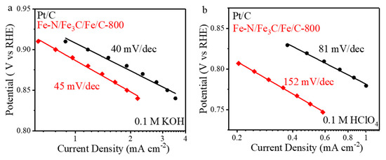 The catalytic activities of Fe-N/Fe3C/Fe/C-800 and Pt/C catalysts for ORR were investigated by cyclic voltammetry (CV) and LSV measurements in O2- or N2-saturated 0.1 M KOH and 0.1 M HClO4 ((Figure 3). Fe-N/Fe3C/Fe/C-800 exhibited a quasi-rectangular double-layer capacity current in N2 saturated 0.1 M KOH solution (Figure 3a). Its ORR peak potential was located at 0.79 V in O2 saturated 0.1 M KOH solution, which was negatively shifted by 0.07 V relative to Pt/C. However, its peak current (106.5 μA) was much higher than that of Pt/C (75.6 μA) (Figure 3a). In the case of the acidic medium, Fe-N/Fe3C/Fe/C-800 also showed a larger peak current of 151.0 μA than that of Pt/C (115.2 μA) (Figure 3c). The higher capacitance currents of Fe-N/Fe3C/Fe/C-800 in both alkaline and acidic media may be caused by a favorable O2 transport within the layer of the catalyst [35]. The catalytic activities for ORR of Fe-N/Fe3C/Fe/C-800 and Pt/C catalysts were also studied by rotating disk electrode (RDE) in Figure 3b,d. The onset potential for the Fe-N/Fe3C/Fe/C-800 in alkaline conditions (1.00 V) was very similar to that for Pt/C. The half-wave potentials (E1/2) for Fe-N/Fe3C/Fe/C-800 and Pt/C were 0.82 and 0.85 V, respectively (Figure 3b). Although E1/2 (0.62 V) of Fe-N/Fe3C/Fe/C-800 was more negatively shifted relative to Pt/C in acidic media, there were insignificant differences observed from their onset potentials (Figure 3d). In addition, the diffusion limited current densities (jL) of Fe-N/Fe3C/Fe/C-800 were 6.23 and 5.48 mA cm−2 at a rotating speed of 1600 rpm in 0.1 M KOH and 0.1 M HClO4, respectively, which were close to the theoretical limiting current density of 6.0 mA cm−2. Figure 4a exhibits the Tafel plots of Fe-N/Fe3C/Fe/C-800 and Pt/C catalysts in 0.1 M KOH, derived from Figure 3b. Fe-N/Fe3C/Fe/C-800 showed a Tafel slope of 45 mV/dec that was similar to that of Pt/C (40 mV/dec), indicating a good kinetic process for ORR. The Tafel plots of Fe-N/Fe3C/Fe/C-800 and Pt/C catalysts in 0.1 M HClO4 are shown in Figure 4b, deduced from Figure 3d. The former had a Tafel slope of 152 mV/dec and the later owned a Tafel slope of 81 mV/dec.
