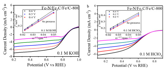The LSV curves of Fe-N/Fe3C/Fe/C-800 at different rotating rates were recorded in Figure 5a,b. The corresponding Koutecky-Levich (K-L) plots were shown in insets of Figure 5a,b. It was reported that relationship can typically be expressed as a function between the inverse current and the inverse square root of the rotation rate with the change of potentials [44,45,46,47]. The average electron-transfer numbers (n) were calculated to be 3.94 and 3.92 for the acidic and alkaline electrolytes, respectively, indicating the ORRs for Fe-N/Fe3C/Fe/C-800 were four-electron process in both electrolytes. The disk and ring current measurements at 1600 rpm in 0.1 M KOH and 0.1 M HClO4 were shown in Figure S2a,b, respectively. Figure S2c shows that the peroxide species yield was less than 12%, and the average electron transfer number was approximately 3.93 in an alkaline solution. For an acidic electrolyte, the peroxide species yield was less than 2%, and the average electron transfer number was calculated to be 3.92. These results were consistent with the electron-transfer number, according to the Koutecky–Levich plots.