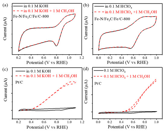 Figure 6. (a) Cyclic voltammograms of Fe-N/Fe3C/Fe/C-800 before and after adding 1 M CH3OH in O2-saturated 0.1 M KOH; (b) cyclic voltammograms of Fe-N/Fe3C/Fe/C-800 before and after adding 1 M CH3OH in O2-saturated 0.1 M HClO4; (c) cyclic voltammograms of Pt/C before and after adding 1 M CH3OH in O2-saturated 0.1 M KOH; (d) cyclic voltammograms of Pt/C before and after adding 1 M CH3OH in O2-saturated 0.1 M HClO4.
