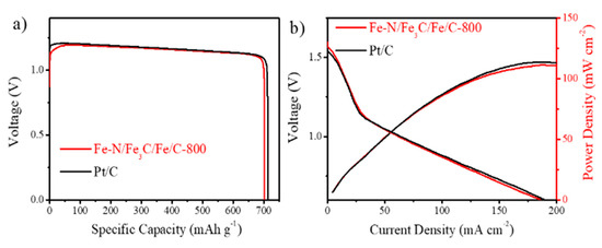 We also evaluated the performance of zinc-air batteries using Fe-N/Fe3C/Fe/C-800-based air cathodes. The specific capacity of zinc-air batteries was obtained in a 6 M KOH electrolyte under ambient air at a current density of 20 mA·cm−2 (Figure 7a). The Fe-N/Fe3C/Fe/C-800 showed a specific capacity of 700 mAh·g−1 that is comparable to Pt/C-based battery. Figure 7b shows voltages and power density as a function of current density for Fe-N/Fe3C/Fe/C-800 and Pt/C. The maximum power density was approximately 110 mW cm−2. Both of them exhibited very similar electrochemical performance. The scarcity and high cost of Pt-based materials limited their scale application for zinc batteries, based on this consideration. Fe-N/Fe3C/Fe/C-800 could be regarded as the promising replacement of noble-metal-based catalysts for zinc batteries.