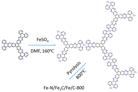 Tri (dipyrido[3,2-a:2′,3′-c] phenazinyl) phenylene (0.2 g) was added into 40 mL DMF, and a homogenous solution was formed after sonication. Then, FeSO4·7H2O (0.38 g, 1.08 mmol) was added into the mentioned solution under vigorous stirring conditions. The resulted solution was heated at 110 °C overnight. Finally, the mixture was transferred to a 50 mL Teflon-lined stainless autoclave and heated at 160 °C for 12 h. The brown solid was collected via centrifugation, washed with DMF and ethanol more than once and dried overnight under vacuum at 80 °C. Finally, the dried precursor was heated to 700, 750, 800, and 850 °C for 1.5 h at a heating rate of 5 °C/min. The pyrolyzed product was ultrasonically leached in 6 M hydrochloride acid (HCl) for 8 h. The leached sample was washed to be neutralized with deionized water, and dried overnight in a vacuum drying oven at 80 °C.
