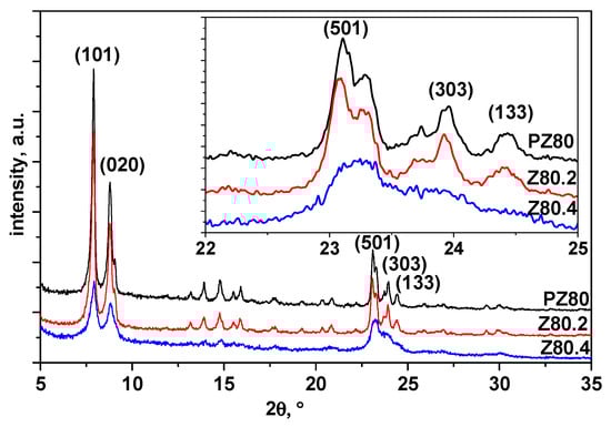 It was found that 0.2 M NaOH treatments of PZ30 and PZ80 did not significantly reduce the material crystallinity. Alkaline treatment of Z30 (up to 0.4 M NaOH) preserved crystallinity up to 87% of the original zeolite, as evidenced by the presence of diffraction lines (101), (020), and (501), which are typical of ZSM-5 diffraction patterns (Figure 1).
