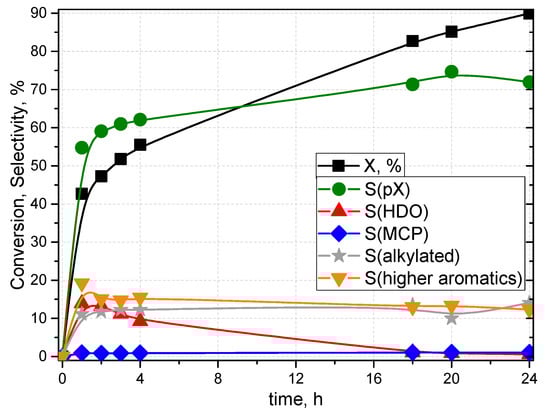 As shown in Scheme 1, p-xylene is formed by the [4 + 2] cycloaddition of DMF with ethylene to form 7-oxabicyclo[2.2.1]hept-2-ene, which is dehydrated to form p-xylene. DMF can be also hydrolysed to form 2,5-hexanedione (HDO), which was shown to be able to dehydrate back to DMF and, according to this mechanism, could still be converted to p-xylene [12]. Trace amounts of 3-methyl-2-cyclopentenone (MCP) were found due to the intramolecular aldol reaction of 2,5-hexanedione. 1-ethyl-2,5-dimethylbenzene, which was found to be a product in the literature [6], was not found in our study. The reaction in which no catalyst was used yielded less than 3% conversion of DMF with no selectivity to any of the identified products. A typical time-dependent profile of the conversion of DMF and selectivities to the identified products is presented in Figure 7.