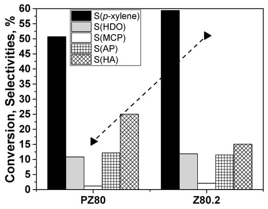 Conversion (X, symbol + line) and selectivity (S, columns) values for untreated PZ80 and treated Z80.4. Conversion (triangle), S(p-xylene) (black), S(2,5-hexanedione) (HDO, grey), S(3-methyl-2-cyclopentenone) (MCP, white), S(alkylated products) (AP, square pattern) and S(higher aromatics) (HA, diagonal pattern). Reaction conditions: 250 °C, 55 bar total pressure (pressurised at 250 °C), 5.5 mL DMF, 0.45 mL tridecane (internal standard), 16.5 mL hexane, 110 mg catalyst, 20 h. The carbon mass balance was in all cases >95%.