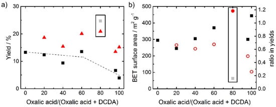 In the following chapter, the composition of the precursor is expressed as the relative oxalate content which is the molar fraction of oxalic acid in the overall sum of structure-forming agent (SFA = oxalic acid and DCDA). In Figure 1a,b the yield and the BET surface area; respectively, are given as a function of the relative oxalate content within the SFA.