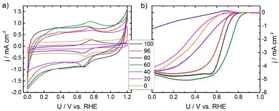 Cyclic voltammetry (100 mV s−1) in N2 saturated 0.1 M H2SO4 (a) and rotating disc electrode experiments (rpm 1500, 10 mV s−1) (b) of the variation series.