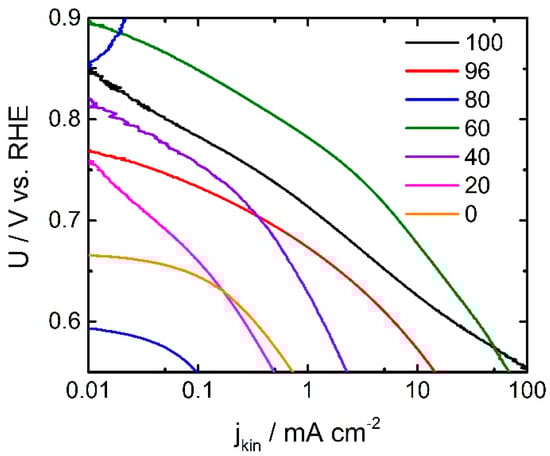 After saturating the electrolyte for 15–20 min with oxygen, three LSVs are recorded in the same potential range with 0, 900 and 1500 rpm as rotation speed. After background correction, the kinetic current density jkin is determined by Equation (1).