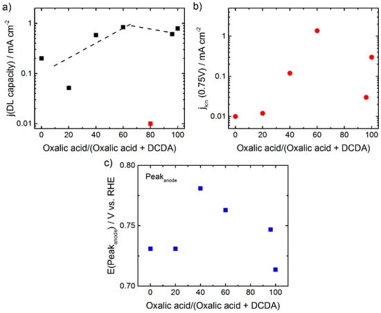 Analysis of electrochemical data. In (a) the current density related to the double layer capacity (100 mV s−1) (■), outlier at 80% (■), in (b) the kinetic current density jkin (●) and in (c) the potential positions of the peak maxima in the anodic sweep of the CVs are given as a function of the ratio of oxalic acid in SFA (■).