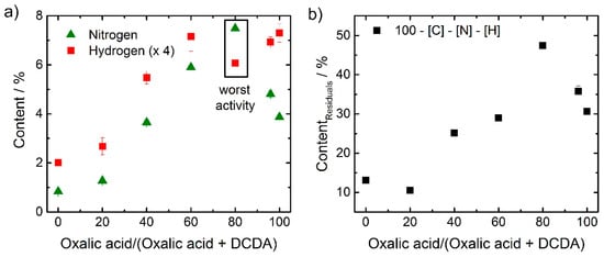 It is well known that the nitrogen content is an important parameter as it is required for the formation of active sites. In order to get further insights to what extend the SFA composition affects the composition of the final catalyst combustion analysis for CHN was performed. The nitrogen and hydrogen contents as a function of SFA composition are shown in Figure 5a. Also, the amount of residuals was determined as difference between 100% minus nitrogen, carbon and hydrogen contents. The data are shown in Figure 5b. The expected residuals were basically iron, sulfur and oxygen, and maybe some chlorine from the acid-leaching procedure.