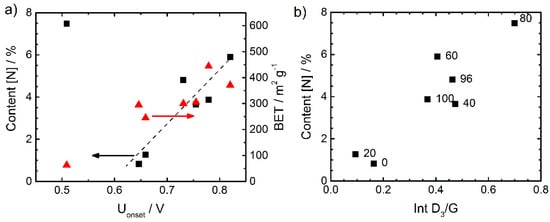 In general, there was a good correlation between the nitrogen content and the onset potential. This is visible from Figure 6a. Also here, the worst performing catalyst gave an exception. It could have its origin in the very low surface area observed for this catalyst (right axis). Figure 6b correlates the content of nitrogen with the intensity ratio of the D3 band and G band, we will refer to it, below after discussing the Raman spectra.