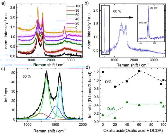 Raman spectra of the variation series (a), spectrum for 80% oxalic acid in SFAs (b) and deconvoluted Raman spectrum (1st order region) of the best performing catalyst with 60% oxalic acid in SFAs (c). Influence of the ratio of oxalic acid in the SFA on the D/G (■) and D3/G band ratios (▲) (d).
