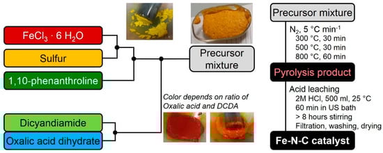 Note, for determining the yields the final catalyst mass (yield after pyrolysis and acid leaching) or the mass after pyrolysis was divided by the related precursor masses of iron chloride hexahydrate, 1,10-phenanthroline and sulfur, without considering the masses of DCDA and/or oxalic acid. This was applied, as otherwise, due to the different molar masses of DCDA and oxalic acid also the absolute mass of the precursor mixture would have changed.