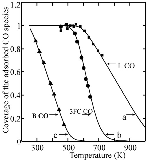 To obtain the individual heats of adsorption of coadsorbed species, the experimental evolutions of the coverage of each species (Figure 2) are compared to theoretical curves obtained by using Equations (4) and (5) and selecting a couple of E0 and E1 values leading to an overlap between experimental and theoretical curves (note that for E0 ≈ E1 the theoretical curve obtained from Equation (4) is overlapped with that from the Langmuir model (Equation (2)). For instance in Figure 2, the curves a, b, c which overlap the experimental data for the L, B and 3FC CO species are obtained considering the following couples of heats of adsorption (E0, E1) in kJ/mol at low and high coverages: (206, 115), (94, 45) and (135, 104). This shows that the AEIR method allows one determining the heats of adsorption of an adsorbed species from a single isobar. The practice shows that the choice of the E1 and E0 values is limited to short ranges (≈±5 kJ/mol) otherwise the experimental and theoretical curves are clearly distinct. This accuracy is due to the fact that E1 and E0 determine the temperature leading to the decrease in the coverage from 1 and the slope of the linear section of the isobar respectively [53].