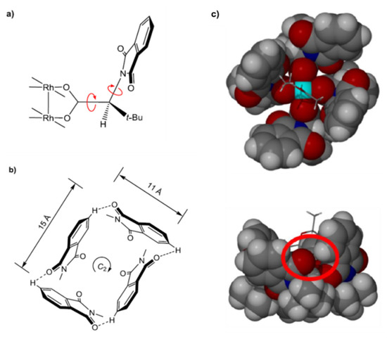 Beyond the overall shape of the irregular crown cavities described above, the mono aquated complex, [Rh2(S-PTTL)4.(H2O)], features a partial “reversal” of its chiral nature (Figure 3a). Whilst all four ligands maintain their S-stereogenic carbon centres, the C–N bond from this carbon centre in one ligand is close to being aligned with the axial coordination site of the Rh centre (circled in Figure 3a). This is in contrast with the clockwise twist reported for [Rh2(S-PTTL)4.(EtOAc)] [47,48] and other related complexes [35,49,50,51]. As a result, the daisy-chain type docking of the N-phthaloyl units around the cavity seen in [Rh2(S-PTTL)4.(EtOAc)], which gives the cavity its main chiral feature (Figure 2c), is not only disrupted but is, in fact, partially reversed. This was most apparent in the formation of an edge (C–H)-face π-stacking of the involved N-phthaloyl unit with an adjacent ligand and a partial loss in regularity of the alternating locations of the oxygen atoms around the cavity compared to Rh2(S-PTTL)4.(EtOAc) structure (Figure 3a).