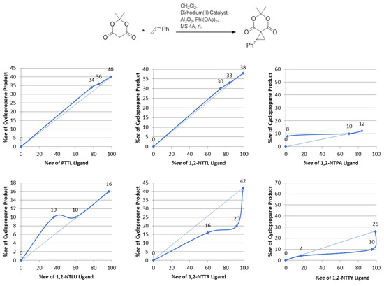 In terms of catalyst enantioselectivity, results are illustrated in Figure 5. As expected, the obtained results for this study, graphically depicted in Figure 5, clearly revealed a modest but real, positive nonlinear effect for Rh2(PTTL)4, Rh2(1,2-NTTL)4, Rh2(1,2-NTPA)4 and Rh2(1,2-NTLU)4 catalysts. The results suggested that diastereomeric species with a partial crown structure similar to the S,S,S,R- diastereomer observed for Rh2(PTTL)4 might be still functional and can lead to enantioselectivity levels similar to the full crown structures.